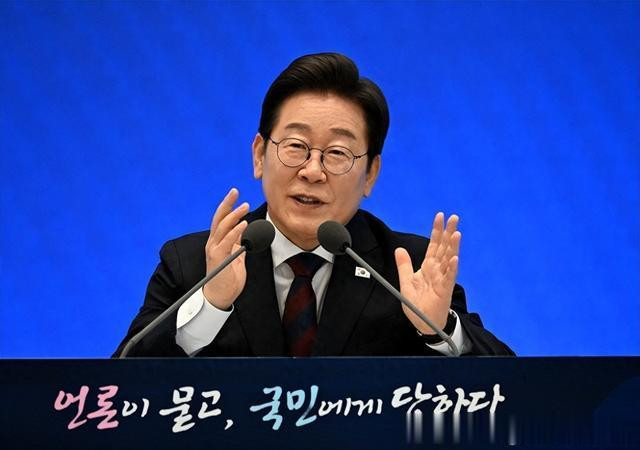 图为3日,韩国总统李在明在首尔青瓦台迎宾馆举行就任30天记者会。【图片=路透社、纽斯频通讯社】